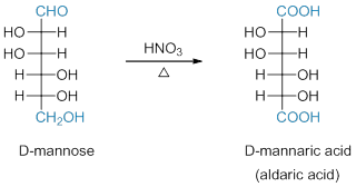 Both aldehyde and primary alcohol groups of an aldose are oxidized by strong oxidizing agent such as HNO3. The oxidized product called an aldaric acid. Ketose also reacts with HNO3 to give more complex product mixtures (Scheme 6).