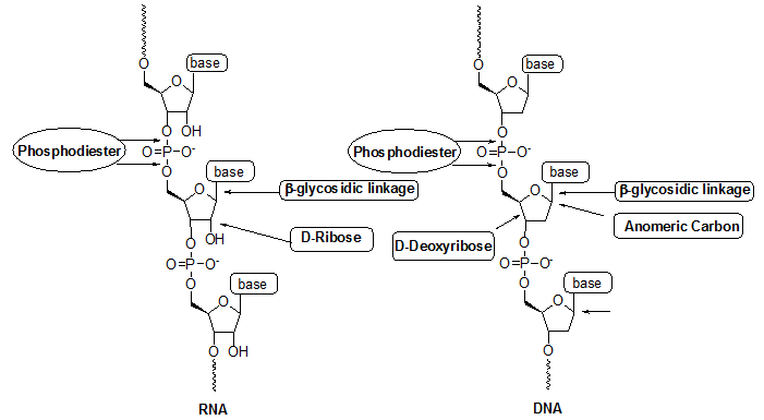 - Nucleic acids are chains of five membered ring sugars linked by phosphate groups (Figure 1). The anomeric carbon of each sugar is bonded to a nitrogen of heterocyclic amine in a b-glycosidic linkage. In RNA, the five membered sugar is D-ribose. In DNA, the five membered sugar is 2’deoxy-D-ribose.