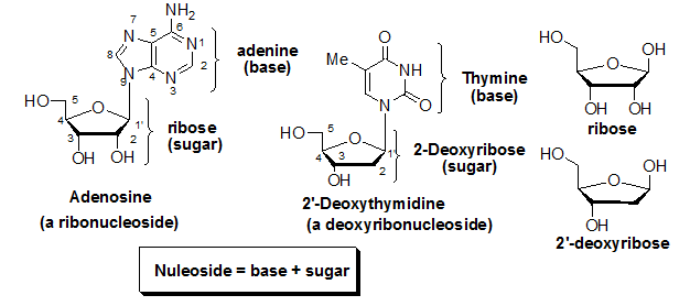 - A compound with a base bonded to D-ribose or 2’-deoxy-D-ribose is called nucleoside. Figure 2 shows an example using adenine as base. Similarly, other bases (guanine, cytosine, uracil and thymine) can also make bond to the sugar to give the corresponding nuleotides. The stereochemistry of the linkage between the base and the ribose is most commonly b.