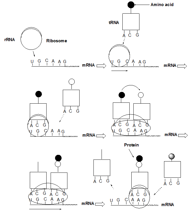 During the synthesis, rRNA attaches to one end of the mRNA strand and travels along the strand (Figure 5). As it travels, the nucleic acid bases of mRNA are read as triplets. The tRNA that recognizes that triplet is bound and brings the amino acid coded by that triplet. The protein is constructed on tRNA and transferred from one tRNA to the next until the synthesis is completed.