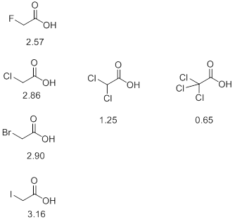 - Similarly, substitutions by electron withdrawing groups tend to increase the acidity of an acid. Thus, in the following series of halo acids it is observed that the pKa decreases with increasing number of halogen atoms. Furthermore, it is also observed that among the monosubstituted halo acids the value of pKa decreases with increase in electronegativity of the halogen. This indicates that the more is the electron withdrawing power of a group, the lower is the pKa (Scheme 5).