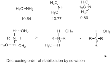 - In case of aliphatic bases, it is thus expected that the increase in the number of alkyl groups will increase the basicity. Thus, basicity is supposed to increase on going from primary to secondary to tertiary amines. In fact, it is observed that in a solution of water, the basicity does increase on going from the primary amine to secondary amine but drops slightly on going to the tertiary amine. This drop is explained by considering the factor of stabilization of the conjugate acid by solvation. As the number of alkyl groups increase, there is a decrease in the number of hydrogen atoms capable of forming hydrogen bonds with water. This in turn has an adverse effect on the stabilization by solvation. If however, the basicities are measured in solvent where stabilization by solvation is insignificant, then the basicity does increase on going from secondary amine to tertiary amine (Scheme 6).