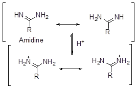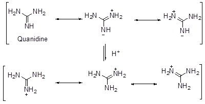 - There is also an effect of stabilization by delocalization in case of strength of bases (like the case of methanoic acid vs ethanoic acid). Thus, it is found that guanidine is much stronger base than amidine which in turn is stronger than urea. The high basic strength is explained by the formation of 3 identical canonical structures of similar energy for guanidium ion. This results in lowering in energy of the molecule and gives stability to the species. A similar case occurs for amidinium ion where there are two such structures of identical energy. In case of urea, there are no such structures of identical energy and thus it is the least basic of the three (Scheme 7).
