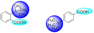 - Steric considerations may also affect the strength of an acid or base. Such an instance is observed in case of o -t-butyl benzoic acid which is ten times stronger than its para isomer. This is totally unexpected since the electron donating inductive effect should be stronger in the ortho isomer compared to the para isomer. However, in this case, the carboxyl group is forced out of the plane of the ring by the bulky t-butyl group in ortho position.