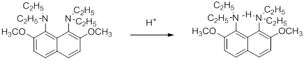 Steric effects can also be caused by other types of strain. 1,8-Bis(diethylamino)-2,7-dimethoxynaphthalene is an extremely strong base for a tertiary amine, but proton transfers to and from the nitrogen are exceptionally slow; slow enough to be followed by a UV spectrophotometer. This is because the compound is severely strained and the two nitrogen lone pairs are forced to be near each other. Protonation relieves the strain: one lone pair is now connected to hydrogen, which forms a hydrogen bond to the other lone pair.