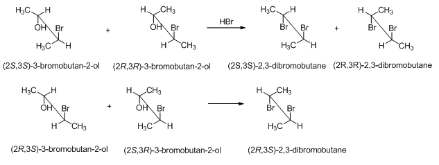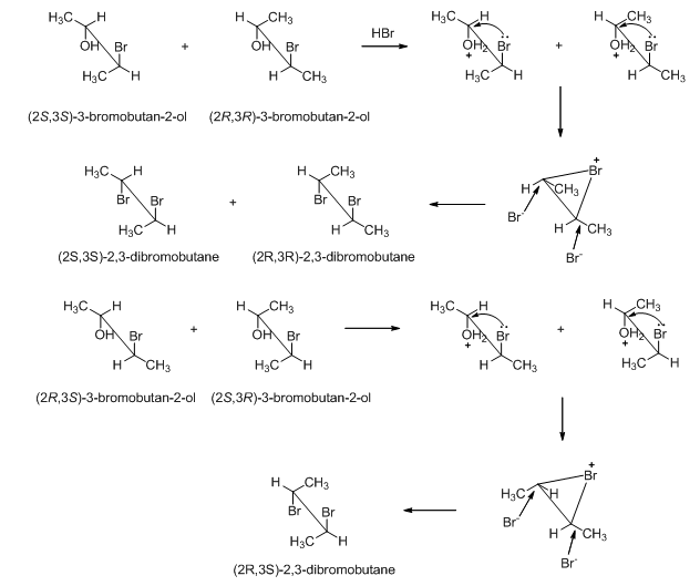 An intriguing result is obtained when the result of treatment of a racemic mixture of (2R ,3R )-3-bromobutan-2-ol and (2S ,3S )-3-bromobutan-2-ol with hydrogen bromide is compared with a similar reaction of (2R ,3S )-3-bromobutan-2-ol and (2R ,3S )-3-bromobutan-2-ol with hydrogen bromide. In the former case, a racemic mixture of (2R ,3R )-2,3-dibromobutane and (2S ,3S )-2,3-dibromobutane is obtained while in the latter case (2R ,3S )-2,3-dibromobutane(meso isomer) is obtained as the only product (Scheme 1). It is thus clear that retention of configuration has occurred in both cases. More importantly, even when one of the enantiomers (2R ,3R )-3-bromobutan-2-ol or (2S ,3S )-3-bromobutan-2-ol was treated with hydrogen bromide both the (2R , 3R )- and (2S , 3S ) isomers are obtained. This suggests that the reaction proceeds through a symmetrical intermediate. It is also reasonable to assume that the reaction follows a SN1 pathway.