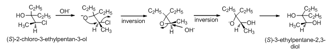 Another consequence of NGP is rearrangement in the product in unsymmetrical intermediates leading to the nucleophile to be attached at a different place than where the leaving group was actually attached. Similarly, the hydrolysis of ( S )-2-chloro-3-ethylpentan-3-ol proceeds with retention of configuration due to the anchimeric assistance provided by the internal nucleophilic OH group (Scheme 3).