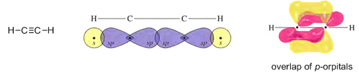 Alkynes are relatively nonpolar and quite soluble in most organic solvents. Acetylene, propyne, and the butynes are gases at room temperature. Alkynes have one σ-bond and two π-bonds. Hybridization of the s orbital with one p- orbital gives two linear sp hybrid orbitals that are used to form the σ-bond with each carbon atoms and with the hydrogen s orbitals. Two π-bonds result from overlap of the two remaining unhybridized p- orbitals on each carbon atom (Figure 1).