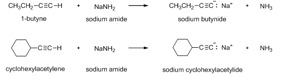 Terminal alkynes are much more acidic than other hydrocarbons. Abstraction of an acetylenic proton gives a carbanion that has the lone pair of electrons in the sp hybrid orbital. Hydroxide ion and alkoxide ions are not strong enough bases to deprotonate alkynes but very strong bases such as sodium amide, deprotonate terminal acetylenes to form acetylide ions (Scheme 1).