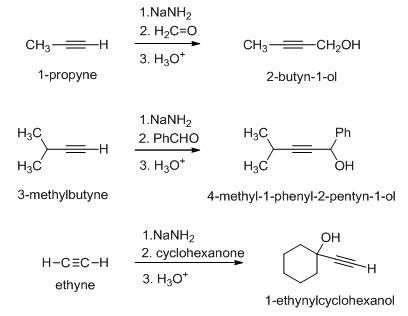 Acetylide ion can also add to carbonyl compounds. A primary alcohol can be synthesized by adding an acetylide to formaldehyde but other aldehydes give a secondary alcohol. Addition of an acetylide ion to ketones gives a tertiary alcohol (Scheme 3).