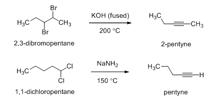 Carbon-carbon triple bond can be generated by eliminating two molecules of HX from a dihalide under strong basic conditions. In the first step vinyl halide is formed by dehydrohalogenation of a geminal or vicinal dihalide. Second dehydrohalogenation occurs only under strong basic conditions since it involves dehydrohalogenation of a vinyl halide. Dihalide is usually heated to 200 °C with strong base such as fused KOH or alcoholic KOH. Sodium amide can also be used for the double dehydrohalogenation that can take place at a lower temperature (Scheme 4).