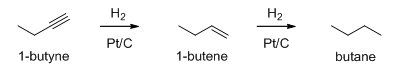 In the presence of a catalyst, hydrogen adds to alkynes to give alkanes. For example, when either of the 1-butyne isomers reacts with hydrogen in the presence of a platinum catalyst, n -butane is formed. Platinum, palladium, and nickel catalysts are commonly used for this transformation (Scheme 5).
