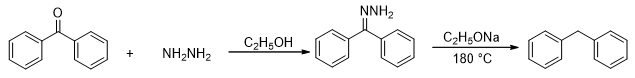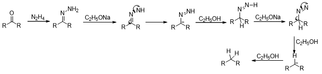 The Clemensen reduction discussed previously cannot be used acid sensitive carbonyl compounds. A method known as Wolff Kishner reduction may be employed in such circumstances (Scheme 8). The protocol involves the synthesis of the corresponding hydrazone from the ketone followed by reduction.