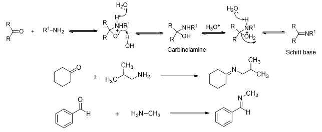 Another type of reactions is the reaction of aldehydes and ketones with substituted amines (Scheme 10). Primary amines react with carbonyl compounds to give an imine (also called Schiff base). As shown above, the initial addition of the amine generates a carbinol amine which then undergoes β-elimination to give the imine as product. The reaction requires acid catalysis for the elimination step. However, the pH of the solution has to be maintained properly since a very low pH will result in protonation of the nucleophile amine.