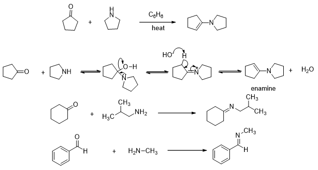 Secondary amines may also participate in this reaction (Scheme 11). They add to aldehydes and ketones to form a carbinol amine which on dehydration leads to formation of an enamine. The pathway of the reaction is similar to the pathway shown above for the reaction of ketones with primary amines. The formation of enamine is of some synthetic importance as it is commonly used as an intermediate in many synthetic protocols.