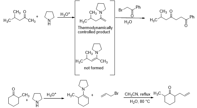 One of the uses is in the selective alkylation as shown below. In this case, only the least hindered enamine is formed. This is because the enamine formation is thermodynamically controlled and, hence, the less substituted enamine is formed slowly. Thus, the alkylation takes place on that side only (Scheme 12).
