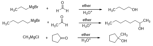 Both aldehydes and ketones react with Grignard reagents to form an alcohol. Formaldehyde forms a primary alcohol as a result of this reaction while the rest of the aldehydes all form secondary alcohols. Similarly, the ketones form tertiary alcohols (Scheme 15).