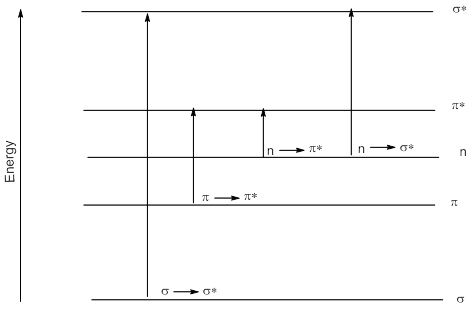 - There are five kinds of orbitals that need to be considered: the bonding σ and π orbitals and their corresponding antibonding σ* and π* orbitals and the non-bonding n orbitals. Normally the bonding orbitals and the non-bonding orbitals are filled orbitals and function as HOMO, and the antibonding orbitals are vacant orbitals and function as LUMO. Of the various transitions possible among these orbitals, the σ to σ* orbital and π to π* orbitals are allowed while the transition from n to π* orbital is disallowed. The energy levels of these levels are given below.