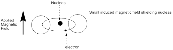 In the spectrum, each line represents a different kind of carbon atom: each one absorbs energy (or resonates—hence the term nuclear magnetic resonance) at a different frequency. The reason that each carbon does not feel the same magnetic field is because of the electronic cloud around them. Each nucleus is surrounded by electrons, and in a magnetic field these will set up a tiny electric current. This current will set up its own magnetic field (rather like the magnetic field set up by the electrons of an electric current moving through a coil of wire or solenoid), which will oppose the magnetic field that is applied. The electrons are said to shield the nucleus from the external magnetic field. If the electron distribution varies from 13C atom to 13C atom, so does the local magnetic field, and so does the resonating frequency of the 13C nuclei. A change in electron density at a carbon atom also alters the chemistry of that carbon atom. NMR tells us about the chemistry of a molecule as well as about its structure.