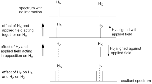 In the spectrum above, the peak centred on 1ppm is for the CH3 protons, the next are for CH2 protons and the peak at around 5 ppm is for the OH proton. There are two things to be noted, the first is the so called “ppm” scale and second one is the splitting of the peaks in the proton signals. The splitting of the signal is due to coupling of the nuclear spins of one atom with another. An explanation can be provided for this phenomenon. If a molecule has two types of proton HA and HX having no interaction between them, then they can be aligned either along the external magnetic field or against it and only two lines are obtained. This can be seen 4,6-diaminopyrimidine-where there are only two single lines (called singlets). However, if there is an interaction between the two types of protons, then a different scenario arises. Now each proton, say, HA , is near enough to experience the small magnetic field of the other proton HX as well as the field of the magnet itself. The diagram shows the result.