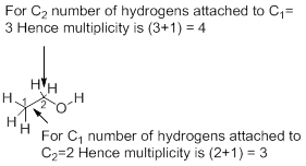 The true spectrum has a pair of doublets each split by an identical amount. It is to be noted that no line appears at the true chemical shift, but it is easy to measure the chemical shift by taking the midpoint of the doublet. The multiplicity (splitting of peaks) can be determined by counting the protons on the carbons attached immediately to carbon to which the referred proton is attached and using the formula n+1. Thus for the CH3 group in ethanol, there is a CH2 group attached to it hence the formula gives (2+1) or 3 as multiplicity.