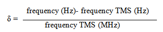 As for the ppm scale, the exact frequency at which the nucleus resonates depends on the external applied magnetic field. This means that, if the sample is run on a machine with a different magnetic field, it will resonate at a different frequency. It would be very difficult if as it couldn't be said exactly where the signal was, so instead how far it is from some reference sample, as a fraction of the operating frequency of the machine is mentioned. All protons resonate at approximately the same frequency in a given magnetic field and that the exact frequency depends on what sort of chemical environment it is in, which in turn depends on its electrons. This approximate frequency is the operating frequency of the machine and simply depends on the strength of the magnet—the stronger the magnet, the larger the operating frequency. The precise value of the operating frequency is simply the frequency at which a standard reference sample resonates. In everyday use, rather than actually referring to the strength of the magnet in tesla, chemists usually just refer to its operating frequency. A 9.4 T NMR machine is referred to as a 400 MHz spectrometer since that is the frequency in this strength field at which the protons in the reference sample resonate; other nuclei, for example 13C, would resonate at a different frequency, but the strength is arbitrarily quoted in terms of the proton operating frequency. The compound we use as a reference sample is usually tetramethylsilane, TMS. The four carbon atoms attached to silicon are all equivalent and, because silicon is more electropositive than carbon, are fairly electron-rich (or shielded), which means they resonate at a frequency a little less than that of most organic compounds. The chemical shift, δ, in parts per million (ppm) of a given nucleus in our sample is defined in terms of the resonance frequency as:
