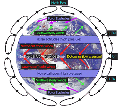 Three bands of low and high pressure above and below the equator (area of low pressure)