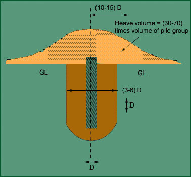 The heaving effect can be felt upto (10 –15) D from the centerline of the pile. Due to driving load, pressure is generated and as a result heaving occurs. Afterwards with time, the heaved part gets consolidated and strength gradually increases as the material regains shear strength within 3 – 6 months time after the installation of the pile. This regain of strength is called thixotrophy.