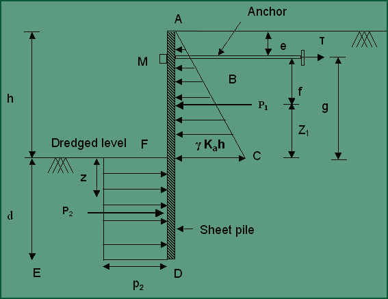 Where, T is the tensile force in the anchor, is the resultant earth pressure acting below the dreaged level, is the resultant earth pressure acting above the dreaged level.