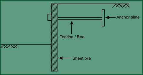 It includes an anchor or tieback at or near the head of the wall. More than one set of anchors or tiebacks can be used. It increases wall stability and enables taller walls to be built and sustained almost a necessity with vinyl, aluminium and fiberglass sheet piles. It is not exclusive to sheet piling; also used with other types of in situ wall systems. In case of cantilever sheet pile walls if the deflection at top point of the sheet pile wall is very large, then settlement of soil takes place at top just behind the sheet pile wall. So, to reduce the excessive deflections the anchors are provided. The different types of anchored sheet pile walls are shown in figure. |