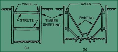 However, if the excavations are relatively wide, it becomes economical to support the Wales by inclined struts, known as rakers (fig-6.6.2b). For inclined struts to be successful, it is essential that the soil in the base of the excavation is strong enough to provide adequate reaction.