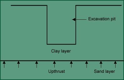 This occurs when a impermeable layer (clay) lies over a permeable layer (sand). At level 1-1, when there is no excavation, full overburden pressure exists. When excavation occurs, at level BC some overburden pressure is released. At the same level 1-1, upward water pressure exists due to presence of sand layer. When no excavation occurs the total overburden pressure is greater than the upthrust, but the layer of soil below the excavation pit may not have sufficient depth to resist the uplift force. Hence if the uplift force the excavation level becomes more, the clay layer bursts open. |