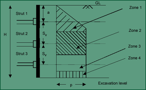 The apparent earth pressure acting on diaphragm wall is chosen as per the type of soil existing in the field. For each strut we get an effective zone over which the earth pressure acts. Usually the earth pressure zones extend from centerline of one strut to that of the other, which implies that each strut takes the earth pressure on either halves upto half the vertical spacing ( ) . As shown zones 1,2,3 apply pressure on the struts 1,2,3. For zone 4, it is assumed that the soil in that portion does not apply pressure and it is taken up by the underlying soil.