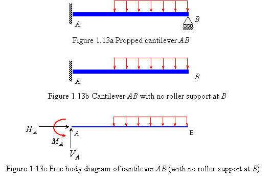 For example, the two-dimensional propped cantilever system in (Figure 1.13a) is an indeterminate system because it possesses one support more than that are necessary to maintain its equilibrium. If we remove the roller support at end B (Figure 1.13b), it still maintains equilibrium. One should note that here it has the same number of unknown support reactions as the number of independent static equilibrium equations. The unknown |