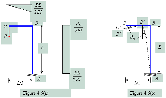 Solution: The M/EI and deflected shape of the frame are shown in the Figures 4.6(a) and (b), respectively. As the point A is fixed implying that . Applying first moment area theorem between points A and B ,