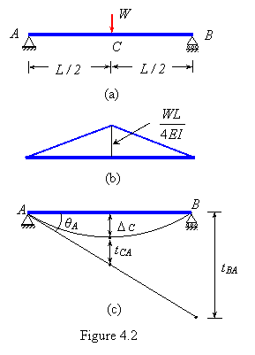 Example 4.1 Determine the end slope and deflection of the mid-point C in the beam shown below using moment area method .