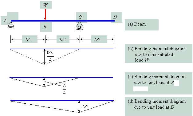 - Draw the corresponding bending moment diagram due to unit load applied in the direction of interested deflection (i.e.