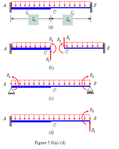 Consider a fixed beam as shown in Figure 5.8(a). The beam is non-prismatic with degree of indeterminacy 2. Three basic determinate structures are shown in Figures 5.8(b), (c) and (d). Among the three structures the computation effort will be minimum for the beam as in Figure 5.8(b) as the resulting basic determinate structure consists of two uniform cantilever beams. |