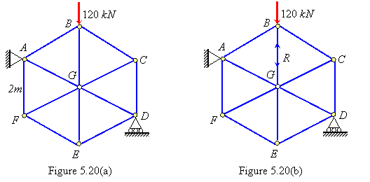 Solution: The static indeterminacy of the pin-jointed frame is =12+3–7×2 = 1. Let the force in the member BG be R as shown in Figure 5.20(b). According to the Castigliano's theorem
