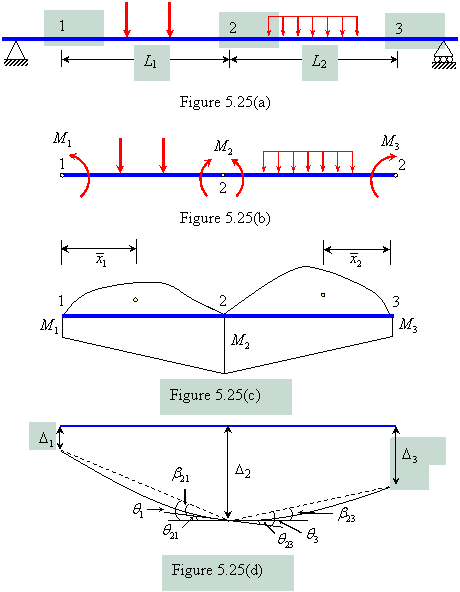 | The continuous beams are very common in the structural design and it is necessary to develop simplified force method known as three moment equation for their analysis. This equation is a relationship that exists between the moments at three points in continuous beam. The points are considered as three supports of the indeterminate beams. Consider three points on the beam marked as 1, 2 and 3 as shown in Figure 5.25(a). Let the bending moment at these points is , and and the corresponding vertical displacement of these points are , and , respectively. Let and be the distance between points 1 – 2 and 2 – 3, respectively. |