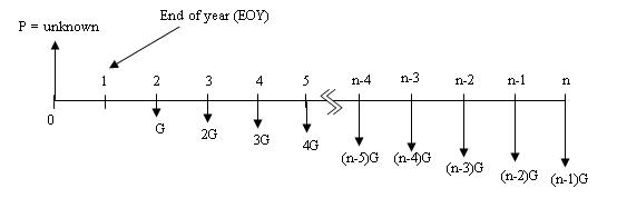 Fig. 1.16 Cash flow diagram involving a uniform gradient with ‘unknown P' |