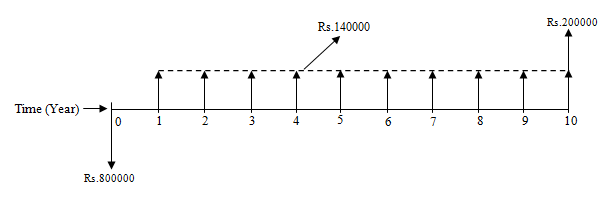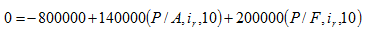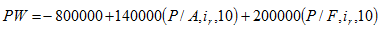 A construction firm is planning to invest Rs.800000 for the purchase of a construction equipment which will generate a net profit of Rs.140000 per year after deducting the annual operating and maintenance cost. The useful life of the equipment is 10 years and the expected salvage value of the equipment at the end of 10 years is Rs.200000. Compute the rate of return using trial and error method based on present worth, if the construction firm's minimum attractive rate of return (MARR) is 10% per year.