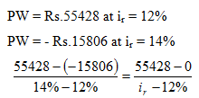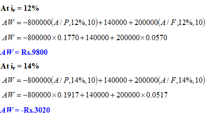 The rate of return ‘ir’ can also be determined by equating the net annual worth to zero. For the above construction equipment, the net equivalent annual worth at different values of ir are calculated as follows;