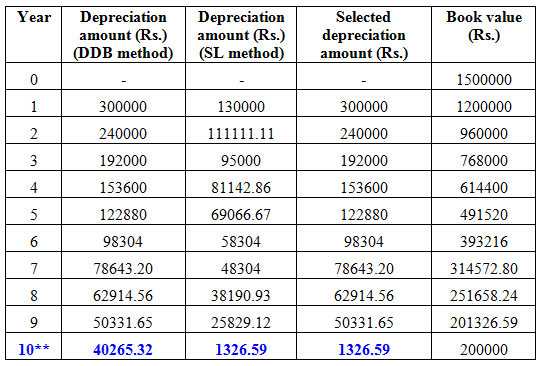 Further the total depreciation amount (i.e. initial cost less estimated salvage value) with switchover from DDB method to SL method is Rs.1300000 (i.e. sum of values in 4th column of Table 3.6) as desired whereas the total depreciation amount without switchover is Rs.1338938.73 (sum of values in 2nd column of Table 3.6).