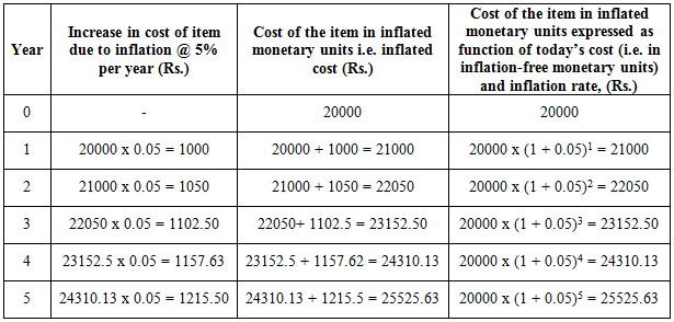 In addition to above parameters, it is also required to define two parameters namely actual monetary units and constant value monetary units while considering the effect of inflation in the cash flow of the alternatives. The monetary units can be Rupees, Dollars, Euros etc. The actual monetary units are also referred as future or inflated monetary units. The purchasing power of the actual monetary units includes the effect of inflation on the cash flows at the time it occurs. The constant value monetary units are also called as real or inflation-free monetary units. The constant value monetary units are expressed in terms of the same purchasing power for the cash flows with reference to a base period. Mostly in engineering economic studies, the base period is taken as ‘0' i.e. now. But it can be of any time period as required.