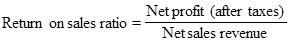 This ratio is calculated by dividing the net profit after taxes by the net sales revenue. Return on sales ratio is expressed as a percentage. It is given by: