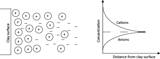 Diffused double layer (DDL) is the result of clay-water-electrolyte interaction. Cations are held strongly on the negatively charged surface of dry fine-grained soil or clays. These cations are termed as adsorbed cations. Those cations in excess of those needed to neutralize electronegativity of clay particles and associated anions are present as salt precipitates. When dry clays come in contact with water, the precipitates can go into solution. The adsorbed cations would try to diffuse away from the clay surface and tries to equalize the concentration throughout pore water. However, this movement of adsorbed cations are restricted or rather minimized by the negative surface charge of clays. The diffusion tendency of adsorbed cations and electrostatic attraction together would result in cation distribution adjacent to each clay particle in suspension. Fig. 2.8 presents such a distribution of ions adjacent to a single clay particle. The charged clay surface and the distributed ions adjacent to it are together termed as diffuse double layer (DDL). Close to the surface there is high concentration of ions which decreases outwards. Thus there are double layers of ions (a) compressed layer and (b) diffused layer and hence the name double layer. The variation in concentration of cations and anions in pore water with distance from clay surface is also presented in Fig. 2.8. A high concentration of cations close to clay surface gradually reduces, and reaches equilibrium concentration at a distance away from clay surface. For anions, concentration increases with distance from clay surface.