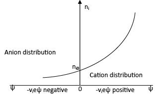 In Fig. 2.9 anion distribution is marked negative due to the reason that vi and ψ are negative and hence -vieψ will be negative. For cations, vi is positive and ψ is negative and hence -vieψ will be positive. For negatively charged clay surface, ni,cations > ni0 and ni,anions < ni0.