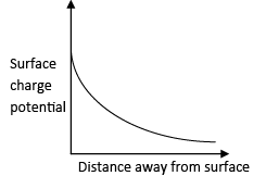 A) Helmholtz double layer: This model follows the simplest approximation that surface charge of clays are neutralized by opposite sign counter ions placed at a distance of “d” away from the surface. The surface charge potential decreases with distance away from the surface as shown in Fig. 2.10.
