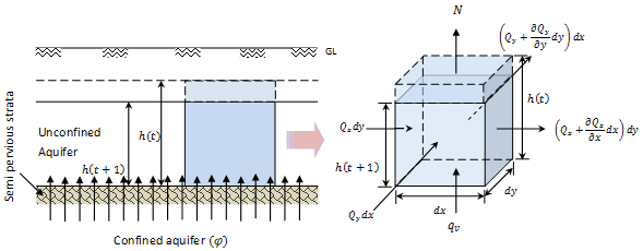 Fig. 11.2 Elementary control volume for leaky unconfined aquifer |